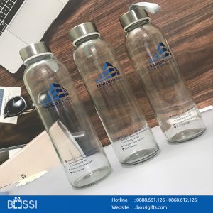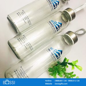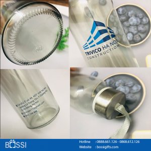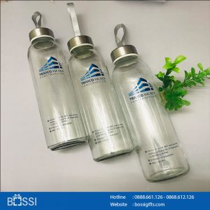 Bình nước thủy tinh 500ML quà tặng in logo Trivico, quà tặng in logo thương hiệu, mang tính thẩm mỹ cao.