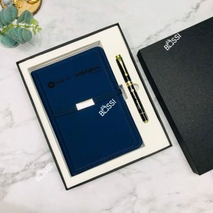Bộ quà tặng văn phòng được Bossi thực hiện toát lên được sự sang trọng và sự chuyên nghiệp, bộ sản phẩm bao gồm: