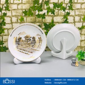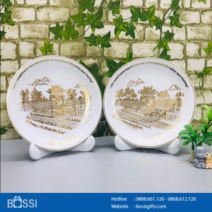 Đĩa trang trí vẽ vàng cảnh Văn Miếu, đĩa sứ vẽ vàng logo SkillingUP – Tổng cục dạy nghề